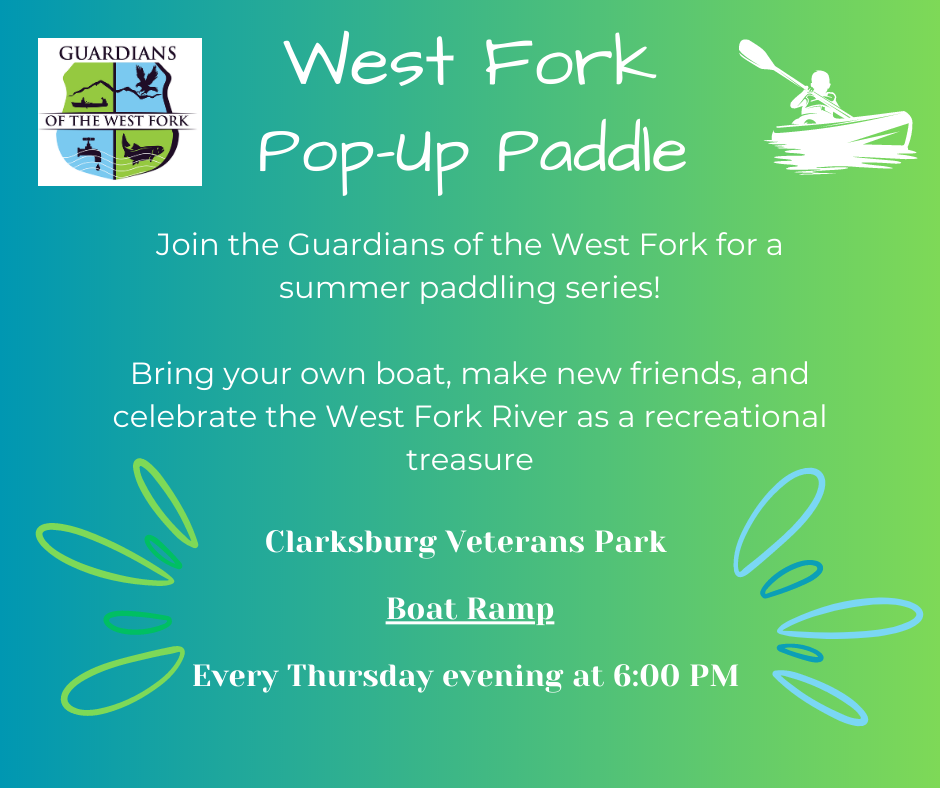 Join the Guardians of the West Fork for a summer paddling series! Bring your own boat, make new friends, and celebrate the West Fork River as a recreational treasure. Clarksburg Veterans Park Boat Ramp (by the dog park and ball fields) Every Thursday evening at 6 p.m. Map Remember West Virginia law requires a whistle … Continue reading West Fork Pop-up Paddles, Every Thursday