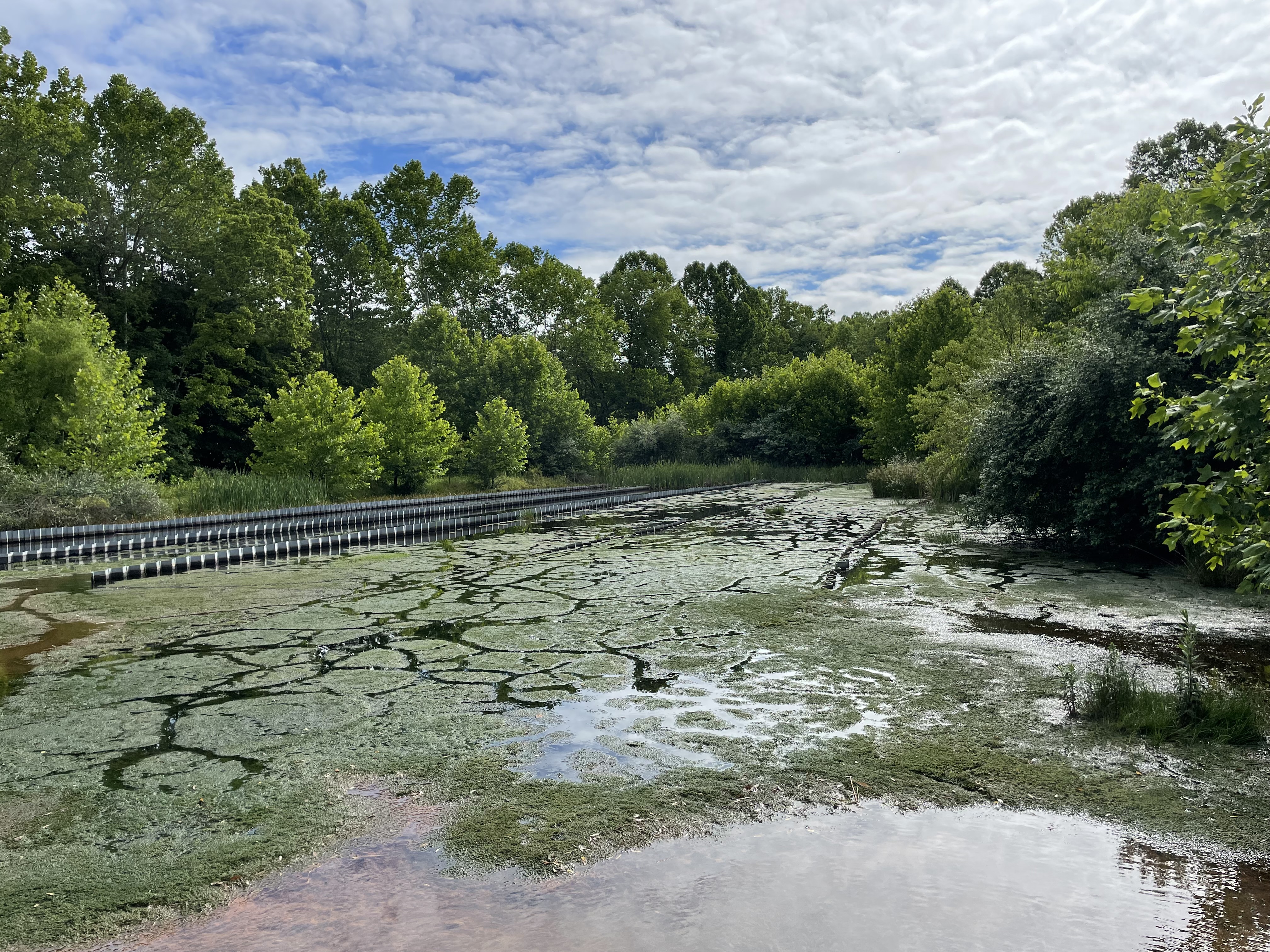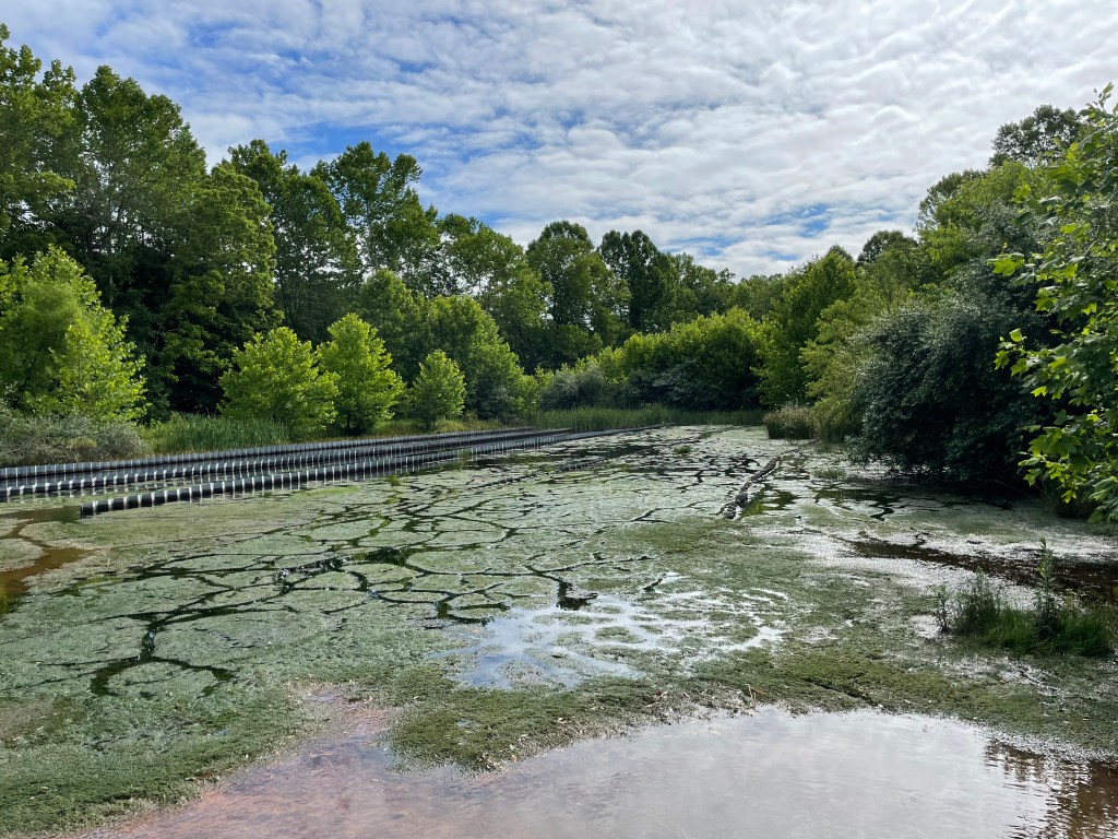 AMD remediation projects divert impaired water through a network of constructed wetlands to slow the flow, allowing suspended metals to drop out of the water and settle at the bottom of the pond.