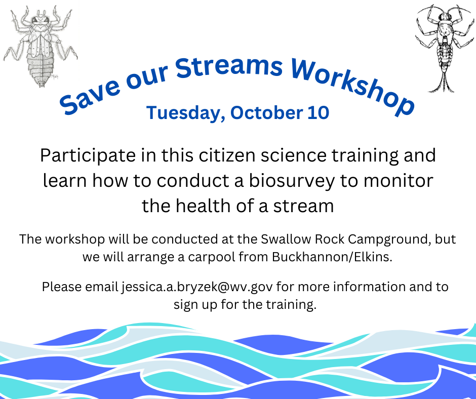 Participate in this citizen science training and learn how to conduct a biosurvey to monitor the health of a stream. The workshop will be conducted at the Swallow Rock Campground but we will arrange a carpool from Buckhannon/Elkins. Please email jessica.a.bryzek@wv.gov for more information and to sign up for the training.