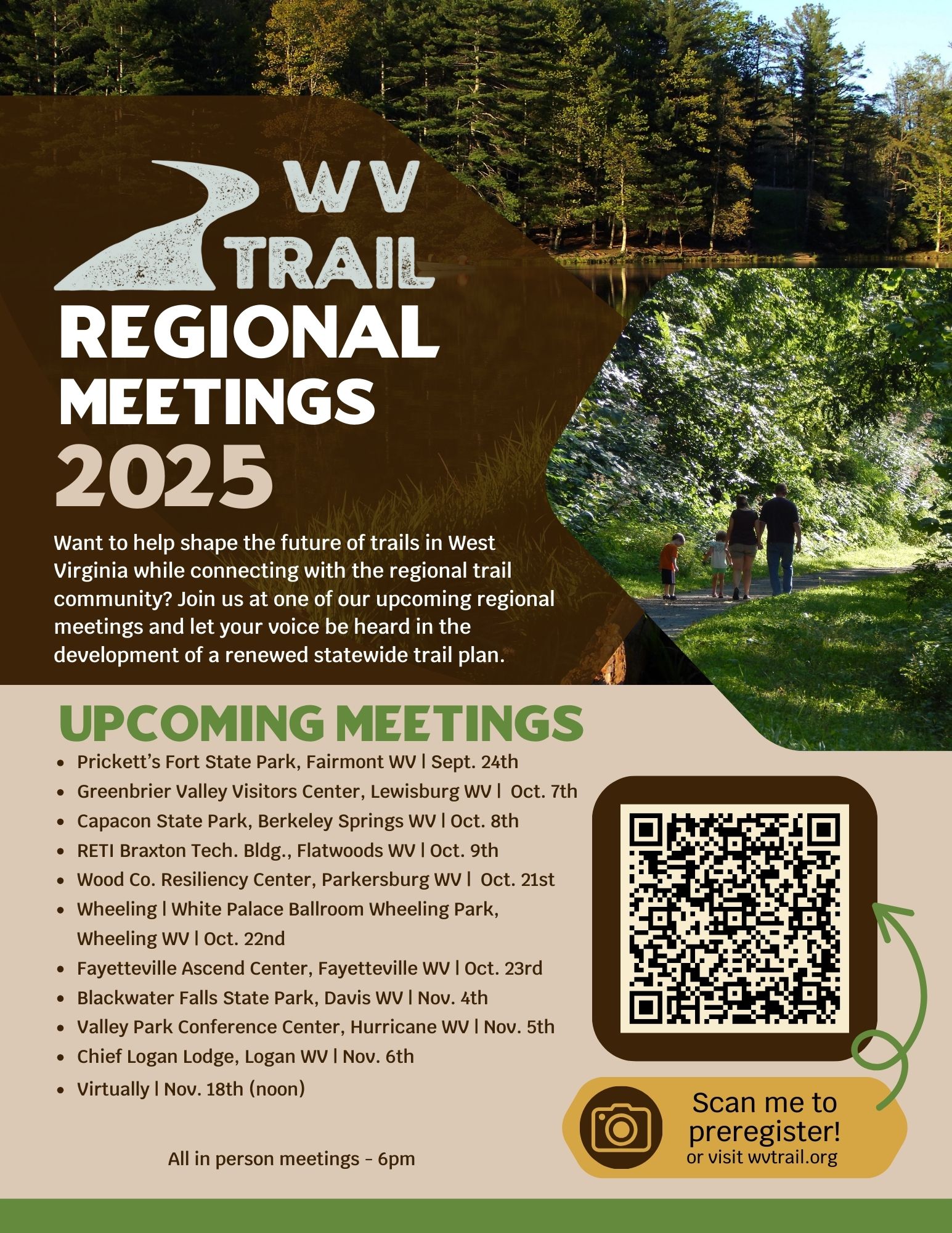 Join Guardians of the West Fork, WV Trail, and partners at one of the Regional Meetings this fall! These workshop-style meetings will help inform the development of West Virginia’s Statewide Trail Plan. Connect with the regional trails community and share your voice at a meeting near you.